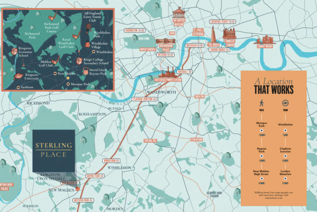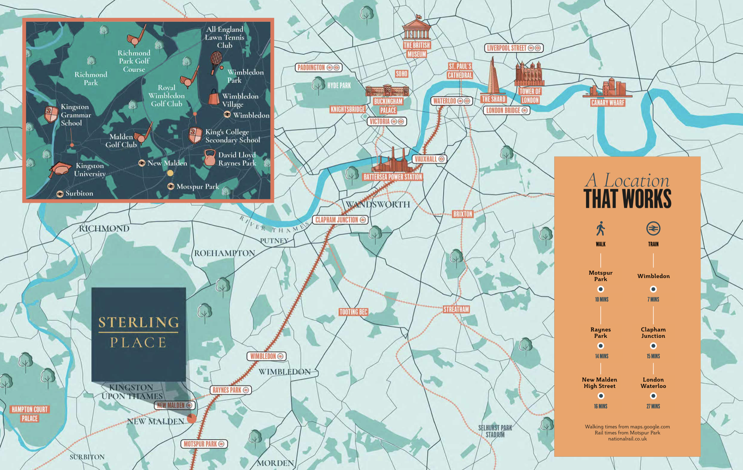 Sterling Place offers the advantage of quick connections, reaching central London in just 24 minutes, while also being in close proximity to Royal Parks and the Surrey Hills, an area of Outstanding Natural Beauty. New Malden features an exceptional range of schools and universities, including Tiffin Grammar School, Kings College School, and Kingston University.